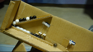 The entire assembly is hot glued to another box at an angle which allows the marbles to be gravity fed. The box is also tilted in a manner such that the undeflected marbles will move toward a hole in one corner of the box, while the deflected marbles will roll toward the other corner.