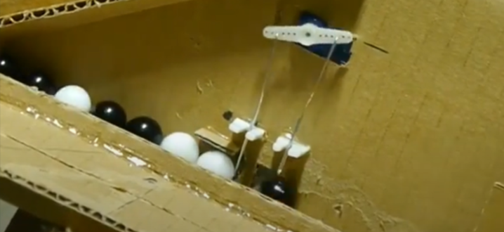 Servo motor two moves a cardboard deflector which determines which of two paths each marble will take. When the deflector is in the up position the marble can go underneath it where it falls through a hole in the corner of the box. When the deflector is down the marble is guided to a hole in the opposite corner of the box.