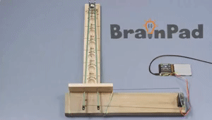 The BrainPad Pulse and BrainTronics are used to control a servo motor that separates and closes two metal rods at precisely the right time in order to drop a ball in the end slot everytime.