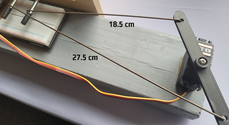 Two coat hanger wires were bent to fit into the holes of the servo horn and around the arms of the Space Force game. Squeeze the ends of the wire with pliers to ensure they don’t come loose. The lengh of the wires is 18.5cm and 25.5 cm. (see photo below)