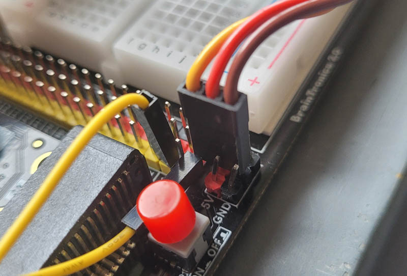 We used the BrainTronics accessory to attach the servo motor connector to the 5v and GND pins since we need 5v to control the motor. We used an additional yellow wire to attach the female end to our control pin. In the case of the Pulse we used pin 0, and then we bent the other male end and put it inside the control pin of the connector, in this case the yellow wire.