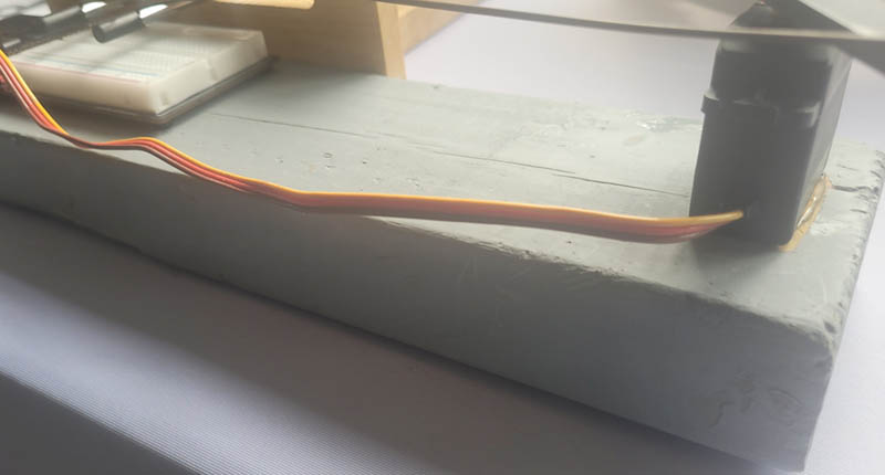 We attached a 2×4 wood base to the end of the Space Force game, and hot glued the servo motor to the end.