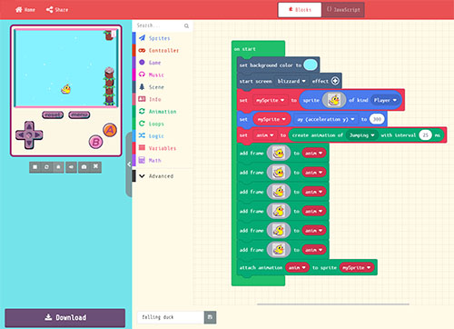 Create games with an Internet browser using Microsoft MakeCode Arcade. Program in Blocks, JavaScript, or Python.