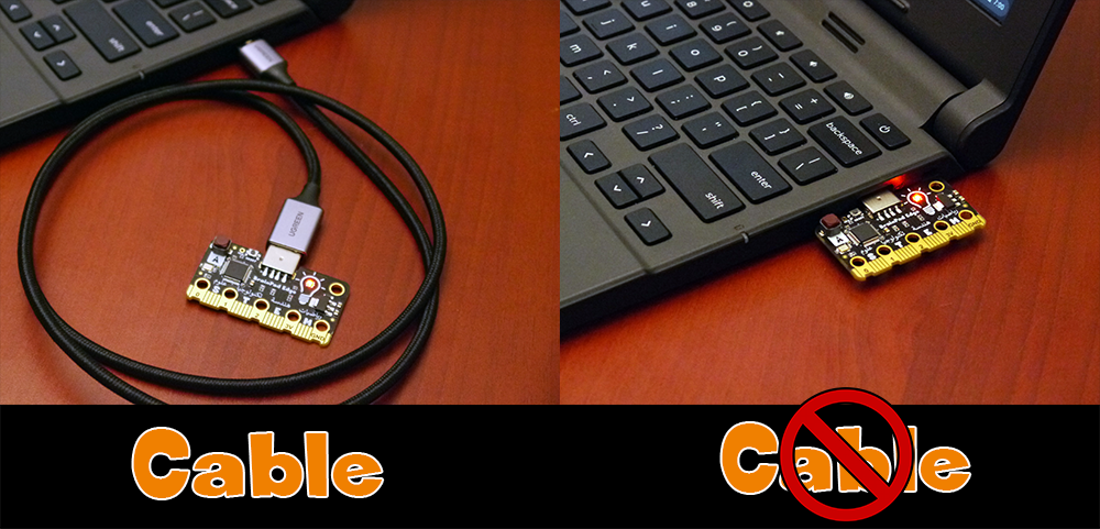 The USB connection on the BrainPad Edge is made for easy, cable-less connection. Plug it directly into your computer or hub. Worry not, any USB cable extension can be used to give the Edge a cable if desired.