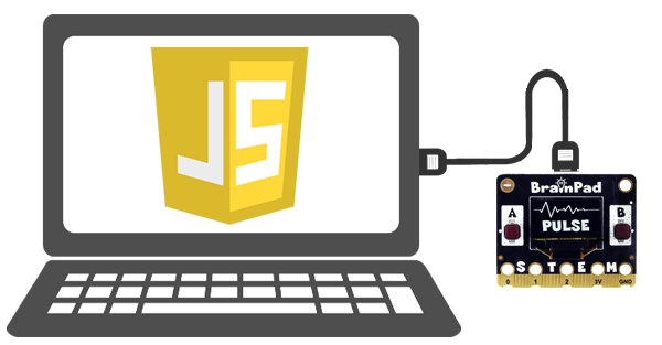 There are two ways to use JavaScript to control the BrainPad. It can be done from a desktop, using Node.js and the SerialPort library. Using an editor, like VS Code, a user can code, debug, and run JavaScript applications on the PC, with full access to the physical world through any of the BrainPad boards.