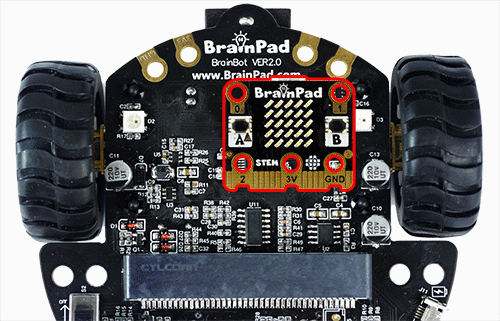 The BrainBot components connect to the BrainPad through the edge connector. The pinout of the BrainPad is shown on its product page. This section shows the BrainPad pin connections on the BrainBot. This is advanced info at this point as we provide a pre-made driver for you to use the BrainBot with ease.