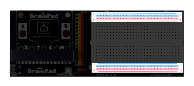 Larger breadboards may also have additional rows on top and bottom, just like the one found on the BrainTronics base board.
