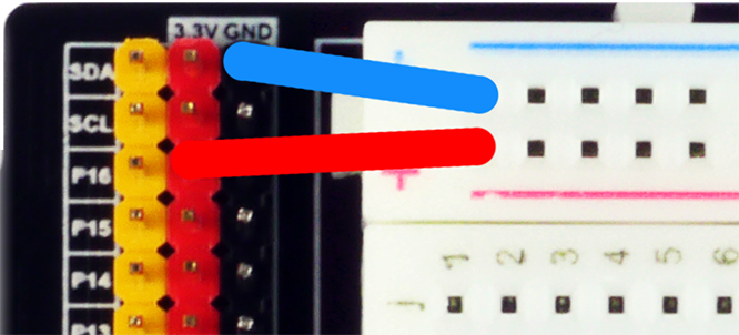 The internal connections of the breadboard can be used to connect components to each other. Let’s add an LED with its needed current limiting resistor between pin 0 and ground.