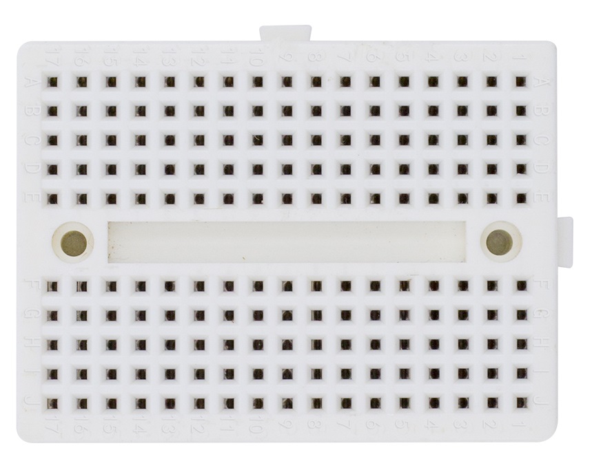 A breadboard is a plastic block with holes that are spaced out 0.1 inches apart. Internally, these holes have metal sockets that create a connection to the electronic components that are plugged in.