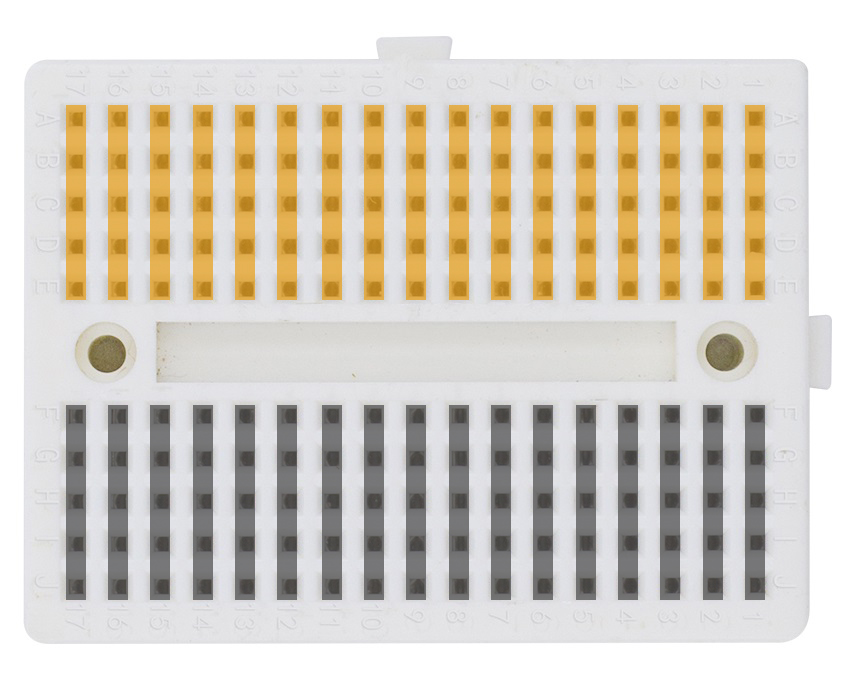 Each column of five holes are connected together internally, but this group is not connected to anything else. Not even the row next to it. In the image below the top side is orange and bottom is grey to show that these two sides are not connected to each other either.