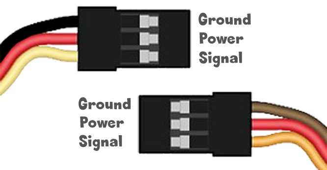 The three wires on a servo are usually Black, Red, and Yellow. The Red and Black ones are for power, where Red is positive (power source) and Black is negative (ground). The Yellow wire is the signal. Some other servos have Orange, Red, and Brown. Where Red and Brown are the power and Orange is the signal. If in doubt, always remember that the middle pin is always the power source, and then the negative pin (the ground) is the darker color, like Brown or Black.