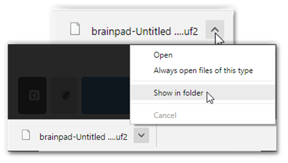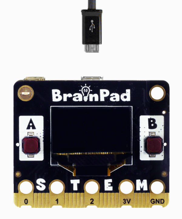 If you still do not see the previous image on the screen (after holding the buttons) then the BrainPad is not prepped for MakeCode. Fear not, the steps are are easy. See the “Prepping for MakeCode” section below.