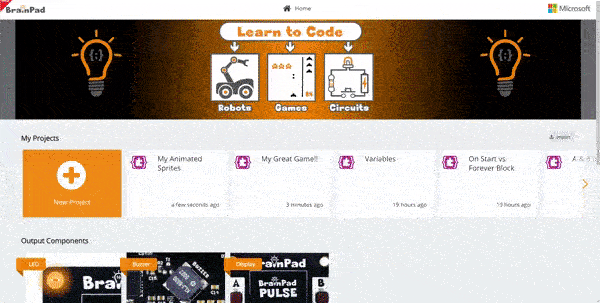 Visit makecode.brainpad.com and click the large + box to start a “New Project”.