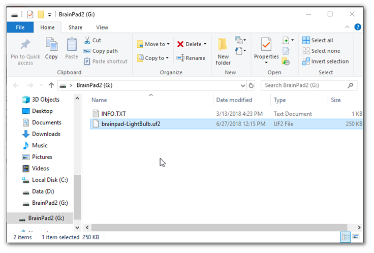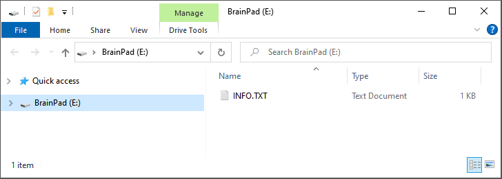 Once BrainPad Pulse is “MakeCode READY” it will present itself to the connected PC as a storage device device called BrainPad with INFO.TXT file. This is just like if you were to plug in a memory stick.