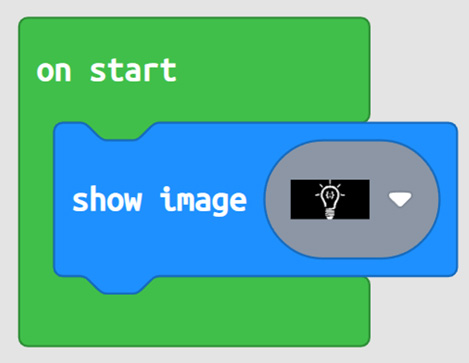 You will be presented with two green blocks, on start and forever. The middle of the screen is the blocks menu options. From Display, drag the show image block into the on start block.