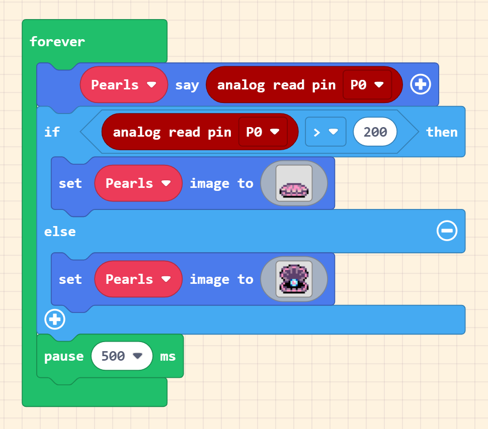 Now, we will program the sensor, using “analog read” If the sensor reads a low value (greater than 200 depending on your sounds) when shout “CLOSE” to tell the pearl to close!